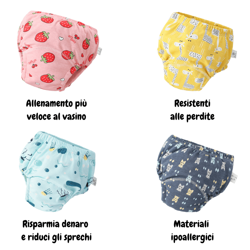 Le mutandine da apprendimento non si buttano dopo l’uso: sono lavabili, comode e progettate per sembrare vere mutandine.