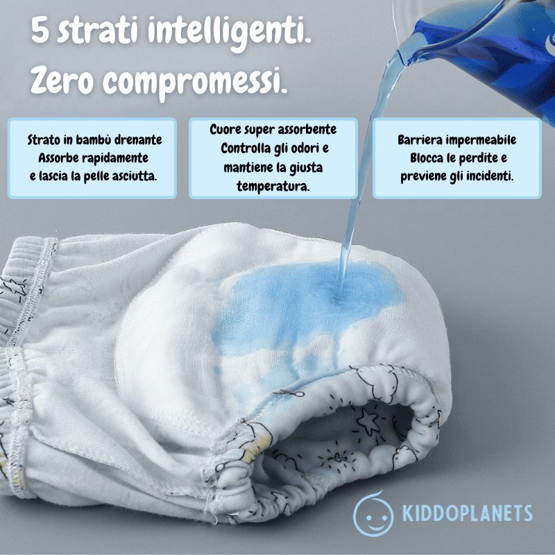 I prodotti usa e getta rallentano l'apprendimento del vasino. Con le mutandine Kiddoplanets, i progressi si ottengono in poche settimane, non in mesi.